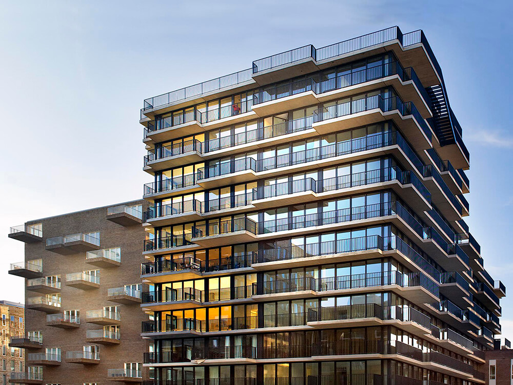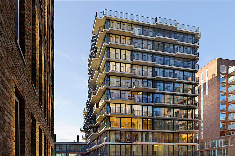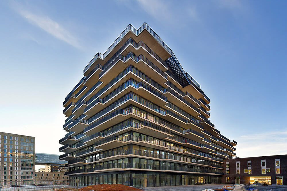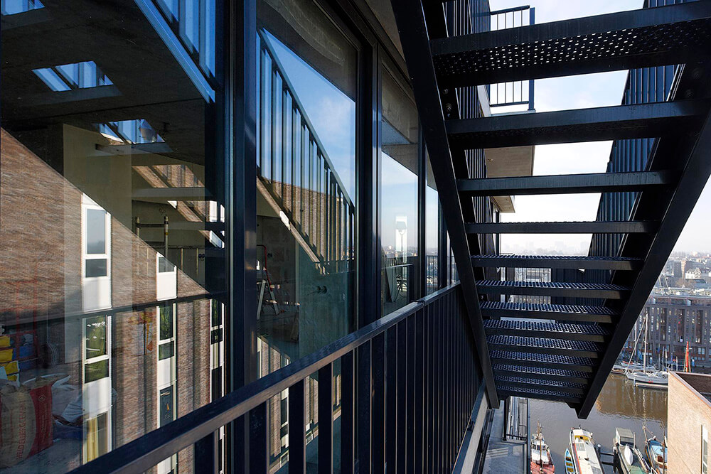 The building has total surface of 6000m² including 46 apartments and a day-care centre. A balcony of varying depths which stretch as bands along the entire facade is found in each apartment, offering varied outside spaces and views over the western docklands of Amsterdam. In contrast with the other buildings is the floor-to-ceiling glass façade that can be fully opened, located inside the so called VOC Cour port redevelopment. Other buildings are mainly made of brick.