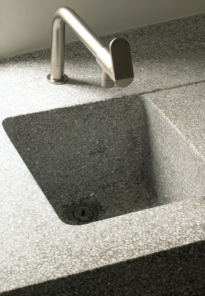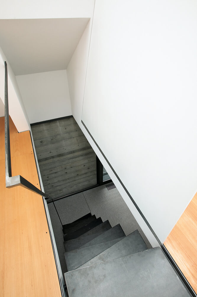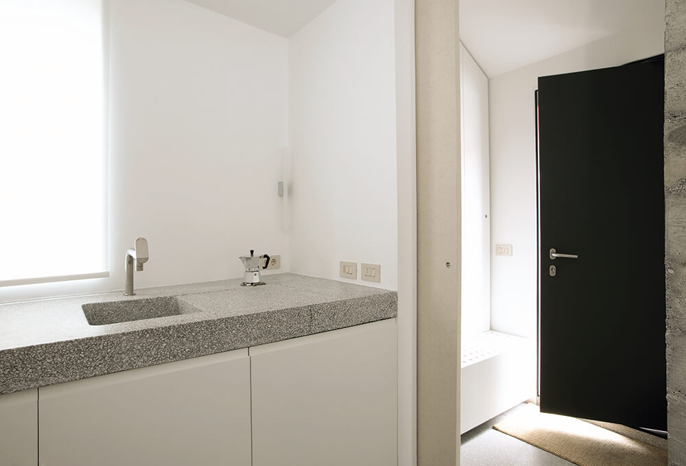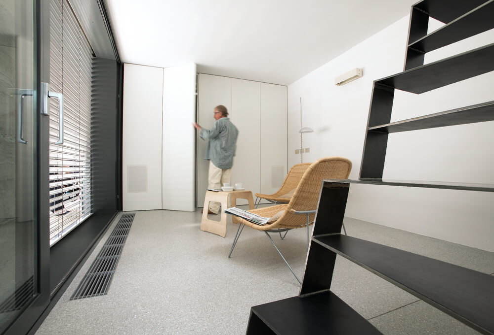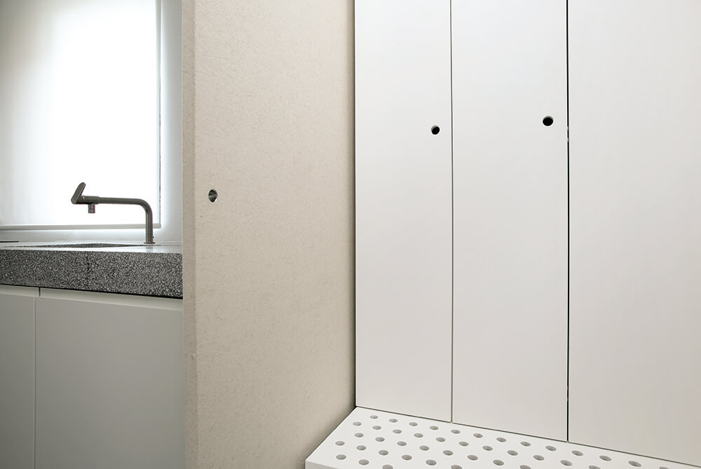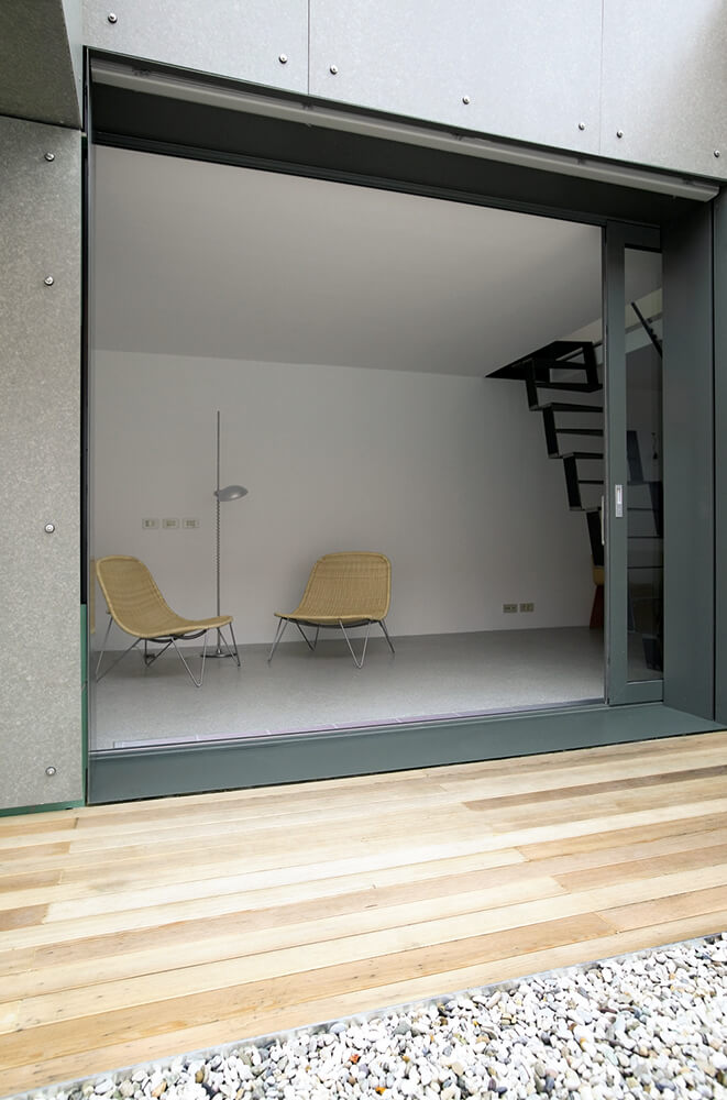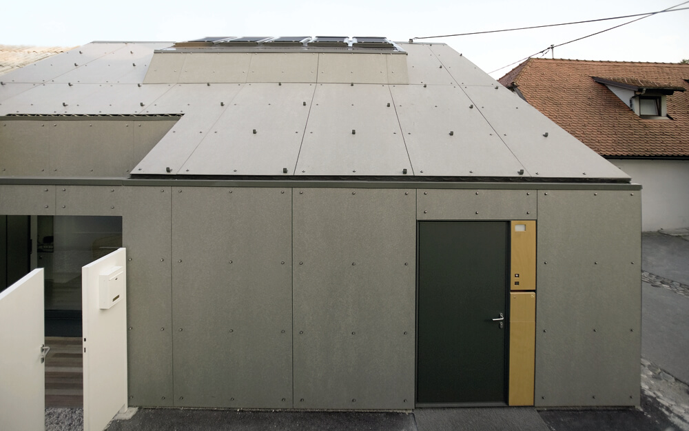 The selection of the façade materials and detailing established the desired service apperance of the house. The concept of raw materials stretches from exterior to interior – using fibre cement panels in their primer mode for the roof and yard façade and ‘béton brut’, terrazzo, plywood, iron, felt for the indoor.