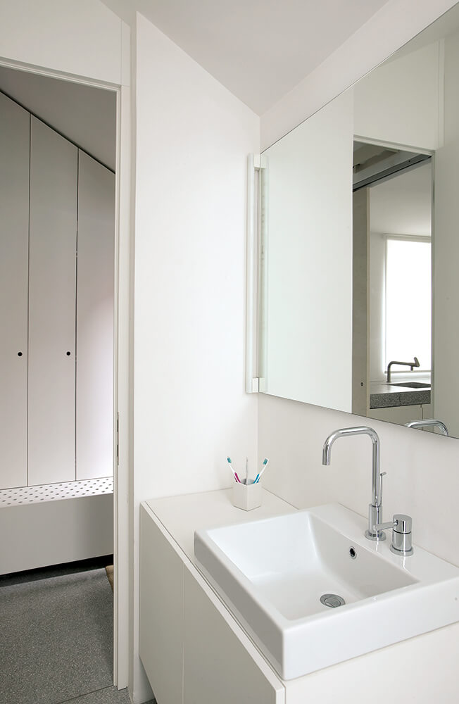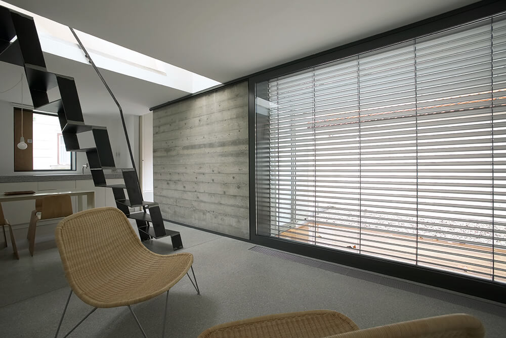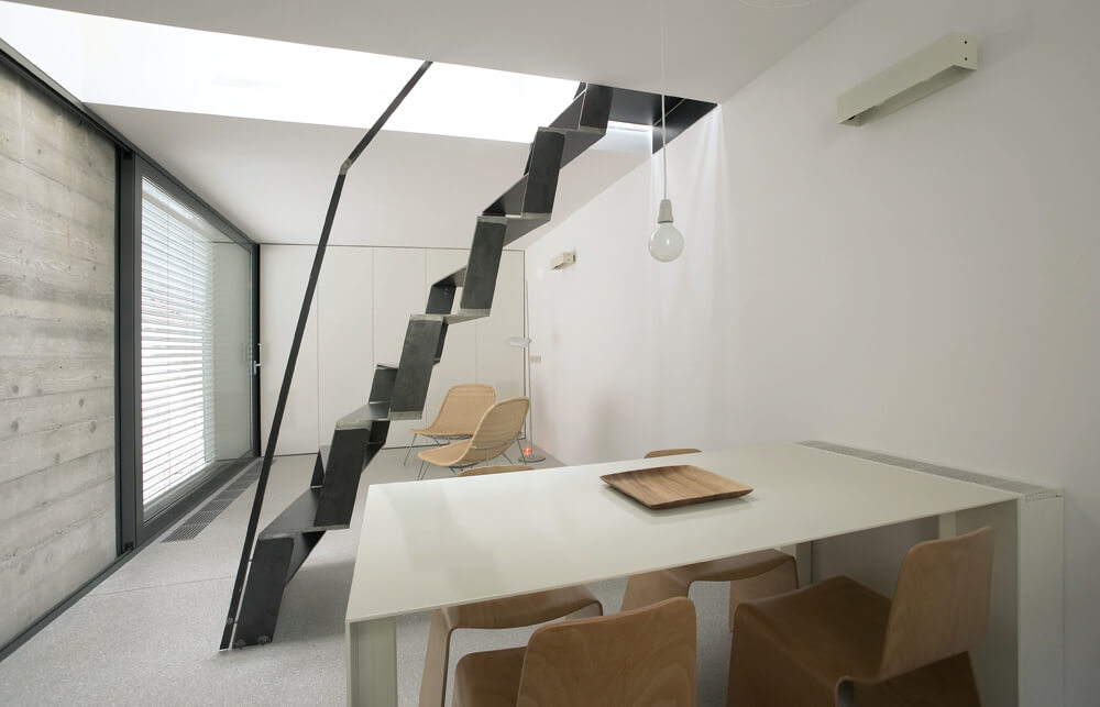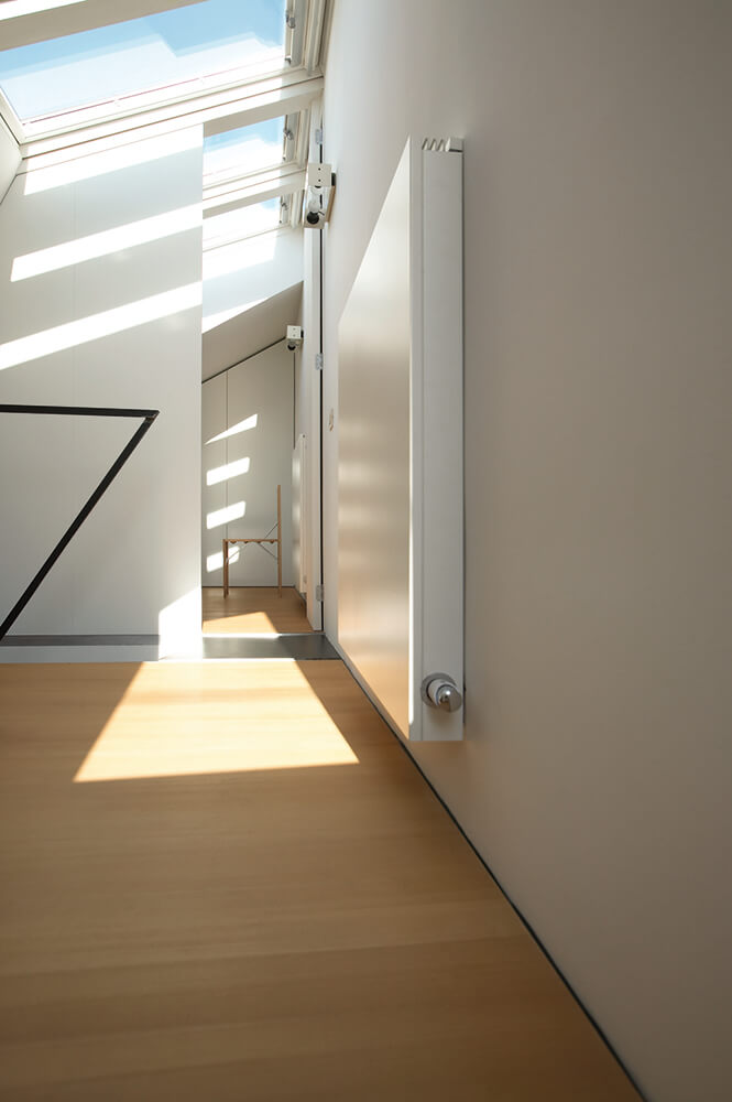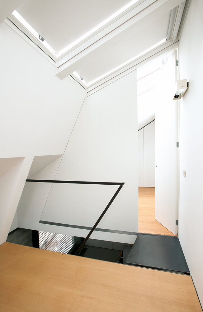 The task was to integrate all residential functions in an extra small volume to suit the needs of a couple living in countryside for their new urban holiday-home. Since the house faces north, it was a challenge to bring the direct and in-direct sunlight to the living spaces in the ground floor. The heritage protection rules allow light shafts on the roofs, but in this case we turned them towards the sky. This major alternation of the volume opend up completly new attic space suitable for use.A huge wall size slide window opens up the space to the intimate atrium and allows for indirect lighting.