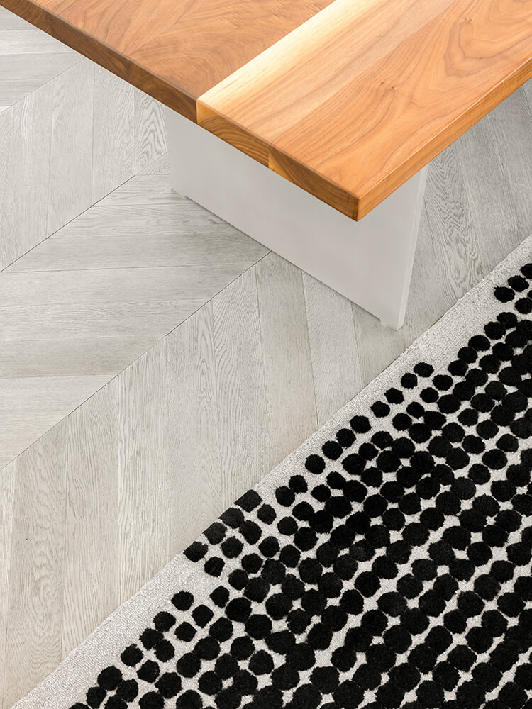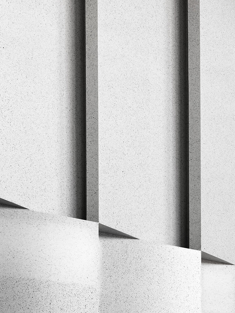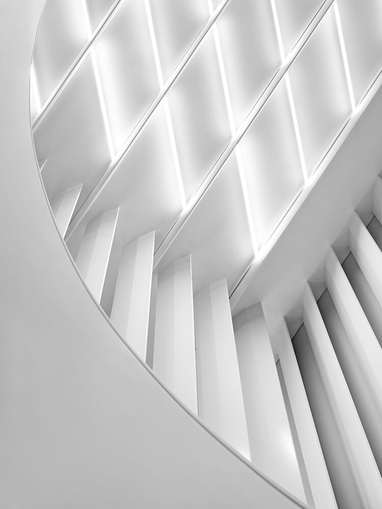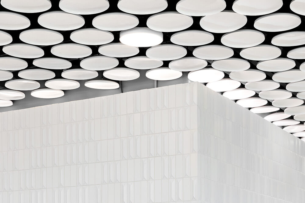 Customers and visitors are welcomed into an impressive lobby, whose magnitude expresses the visionary dimensions of the new technologies that are shaping the future. The precision of a nanochip is translated into a structural clarity in which white-on-white shapes and surfaces meld and merge. The interplay of their different materiality generates a depth of perception, which allows the abstract to emerge as a space of potential. A polished marble floor meets expressively modelled Italian terrazzo, which breaks up the daylight in the lobby through its acute, offset angles. This three-dimensional design creates a play of light and shadow that gives the space its plasticity: clear and succinct, yet open and bright, this is a level of precision that radiates dynamism.
