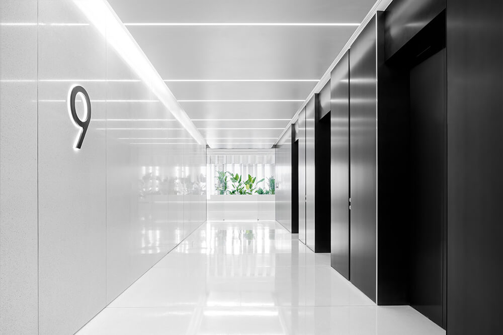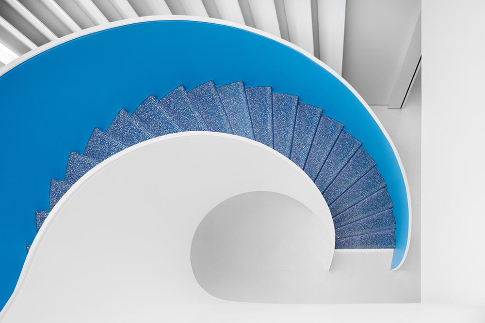 The customer journey continues in the lift lobbies, which echo the design idiom of the lobby, complementing the already familiar pairing of white and green natural stone with black metal cladding. The two-storey reception area of the ninth-floor headquarters is connected by a white staircase that achieves a soft and curving iconographic effect. In its size, it appears sculptural yet dynamic, abstract yet full of personality. Tranquillity and clarity find expression in this monochromatic design, which helps the deliberate, sparingly placed colour accents to make a particular impact without interrupting the overall fluid effect. Together with the light-channelling ceiling lamellae, a space is created that speaks for the radiance of innovation, and focuses on a combination of precision and vitality.