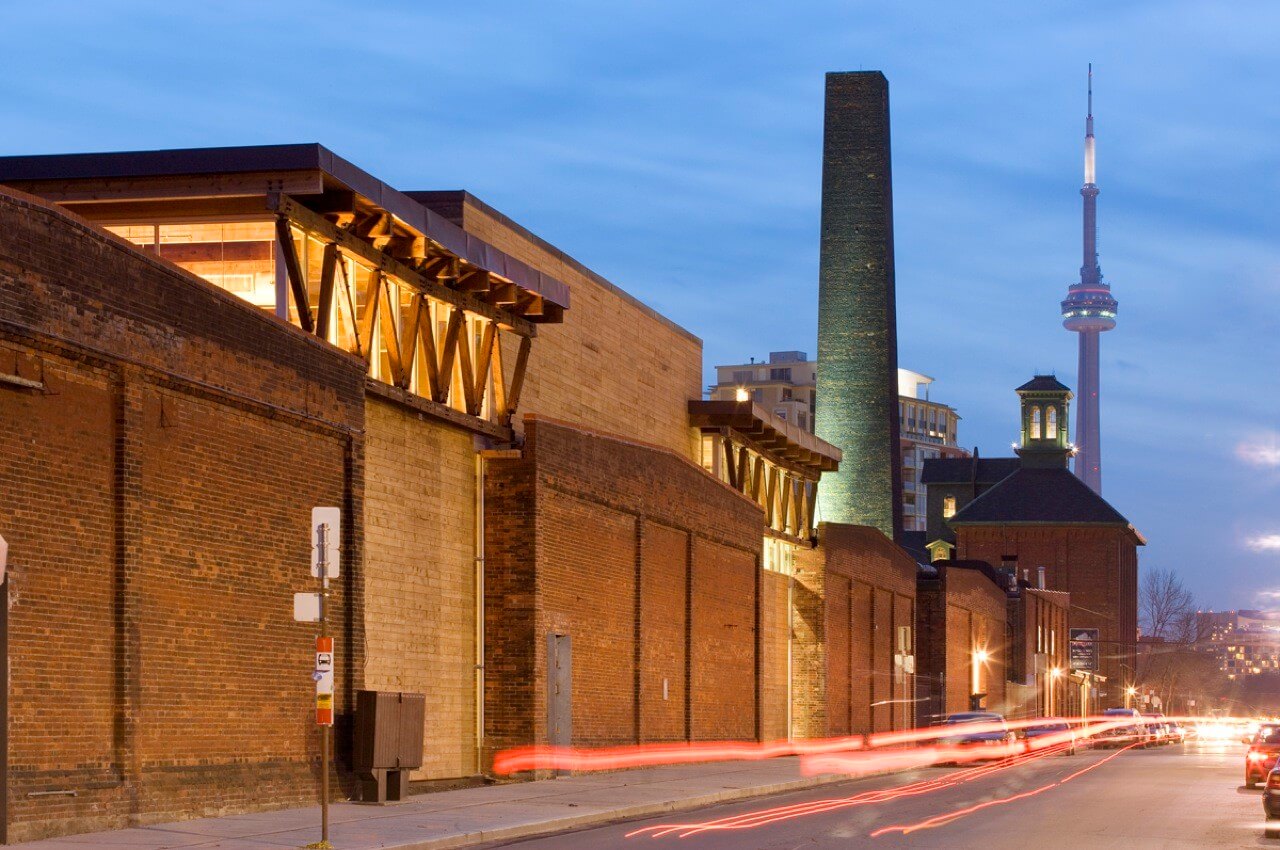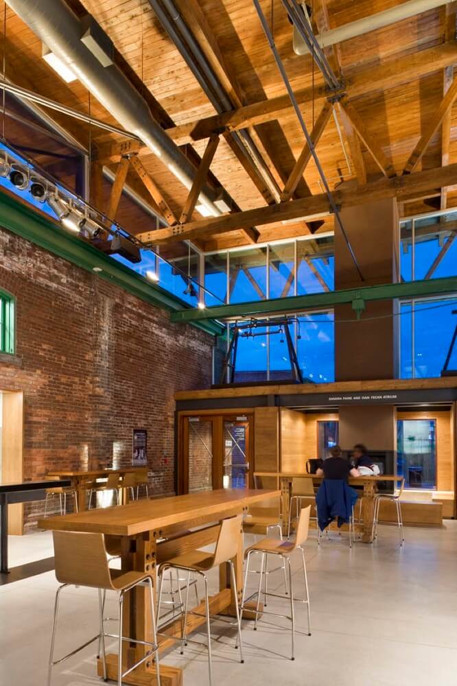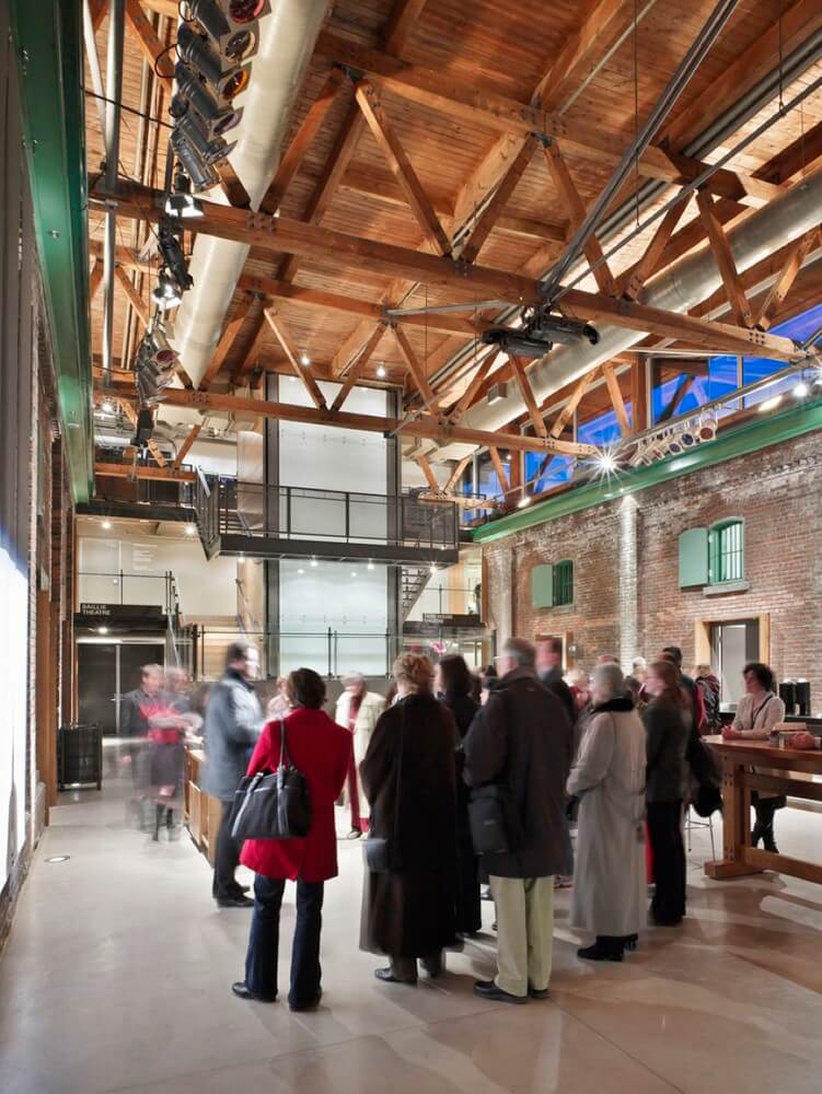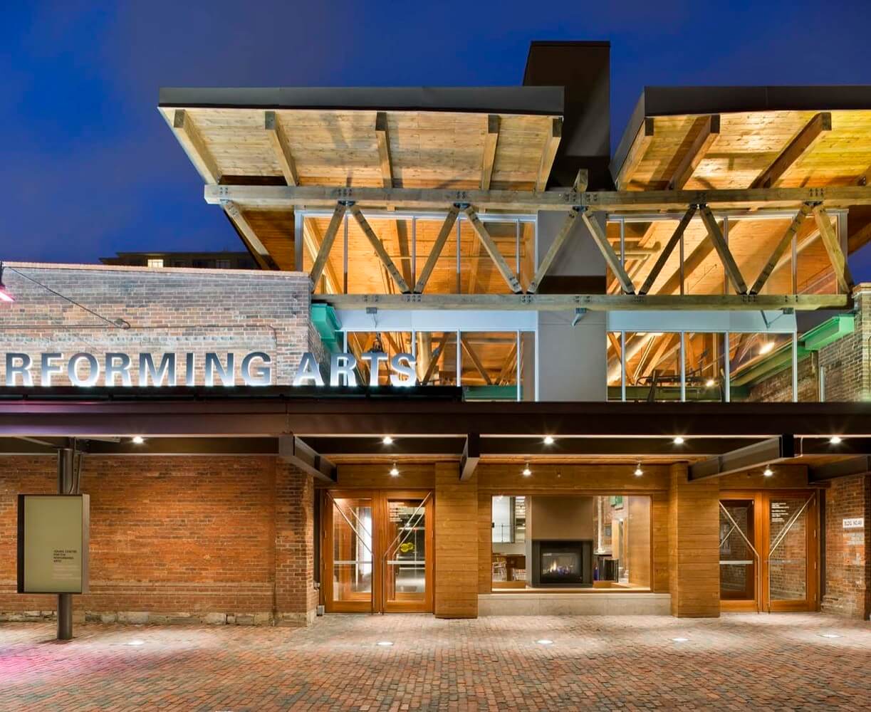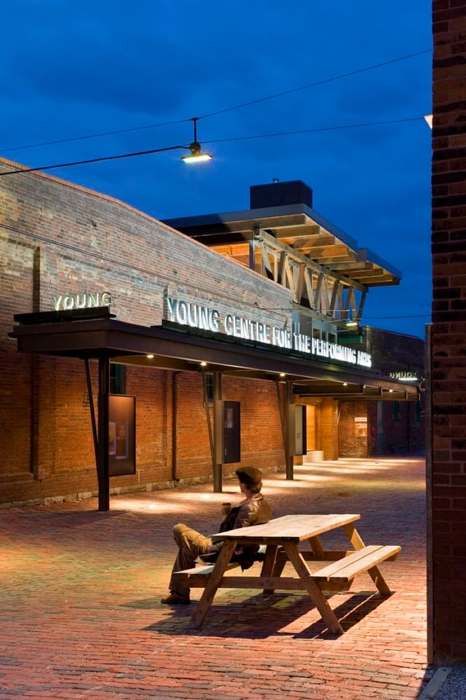 The Young Centre for the Performing Arts (YCPA) was constructed based on a unique partnership between George Brown College and Soulpepper Theatre Company. The Young Centre is located within a former industrial site transformed into an arts precinct known as Toronto’s 19th century Gooderham & Worts Distillery District. It is housed by two historic tank houses and the space between them. A new wood canopy marks the main entrance. A roof and clerestorey supported by massive Douglas fir timber trusses spans the bearing walls of the tank houses and encloses the space between the tank houses to form the heart of the project. It is a place where students, actors and patrons can mingle during the day and evening. The project consists of four theatre spaces of various capacity and among them are a 400-seat flexible courtyard theatre and multivalent studio spaces that can be used for both practice and performance. Red brick and dark timber and also concrete floors and painted walls are all used to accommodate a budget that is tight while reflecting a commitment to drama as an art form that transcends its setting. These are limiting the utilitarian material palette.