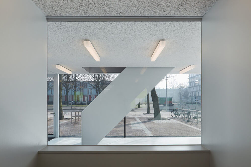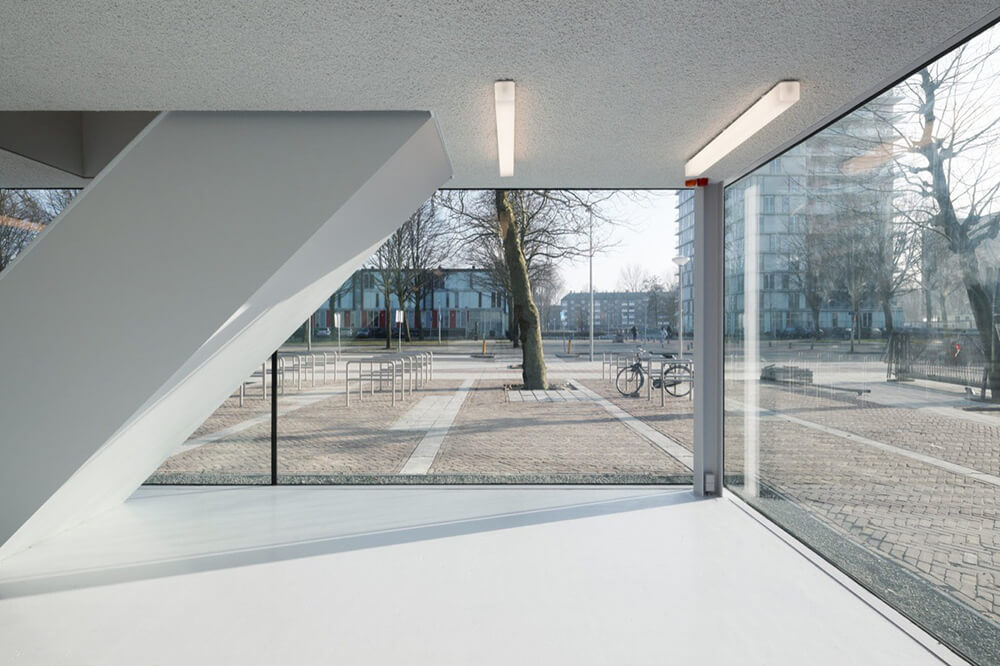 The final building is consisted of the simple stacking of two – diametrically opposed – concepts of space. The ground floor level is designed to have a flat sandwich-space that opens up completely to the surroundings thanks to the glazing on all sides. The public green and its dominated tree canopy has the ability to become part of the interior and generously extends the small space to the outside. This effect is enhanced by the modest interior design and the grayish color scheme. Activities on the inside are well visible and stimulate the direct interaction with the public space, while being as a “public living room” of the neighborhood.