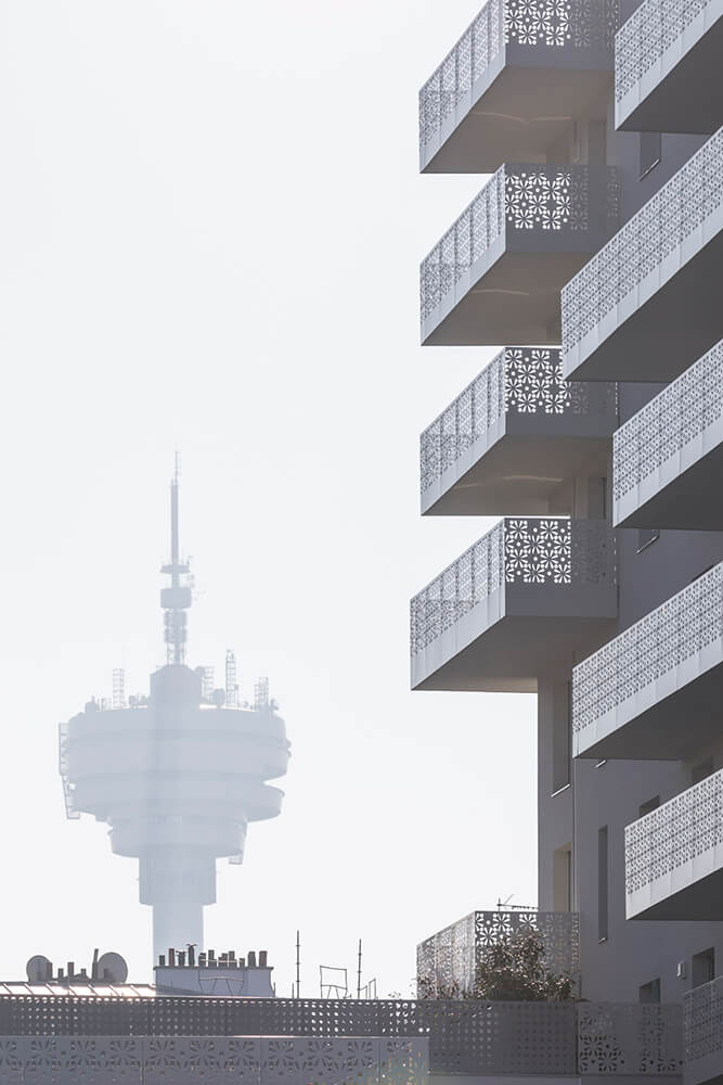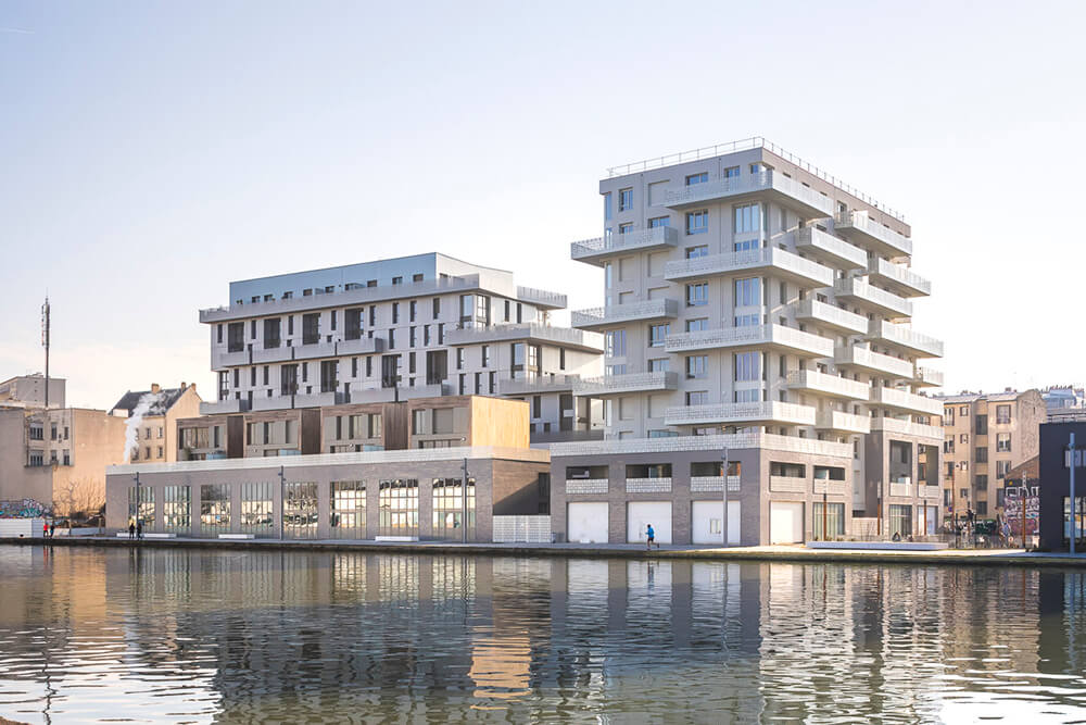 The purpose of the building base is to protect the housing units from the noise nuisance coming from the road and the walkway along the canal. The objective of designing the two buildings is to create double exposure, diagonal views and transparency on all the levels of the block.