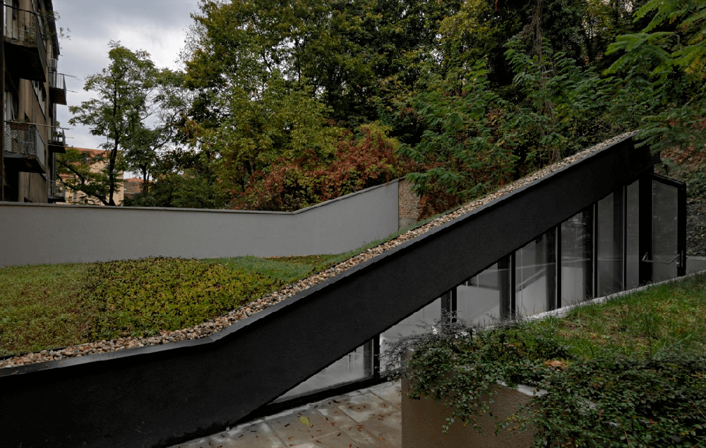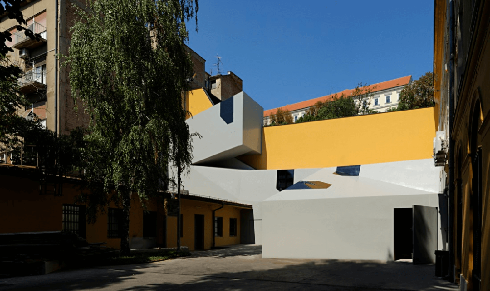 The new entrance lobby is the only one new architectural element of the centre, a polyvalent space in the service of communication and meeting with a cafe, library and a video store. It was interpolated on the basis of almost Default parameters of the existing neighbouring houses were the basis that interpolated the centre. The volume and its broken form also suggest dance movement and they are a new sign and connection element between the courtyard and the roof terrace. The final element of the centre is its roof terrace and an important part of the project of preservation and restoration of Zagreb last open roof stage.