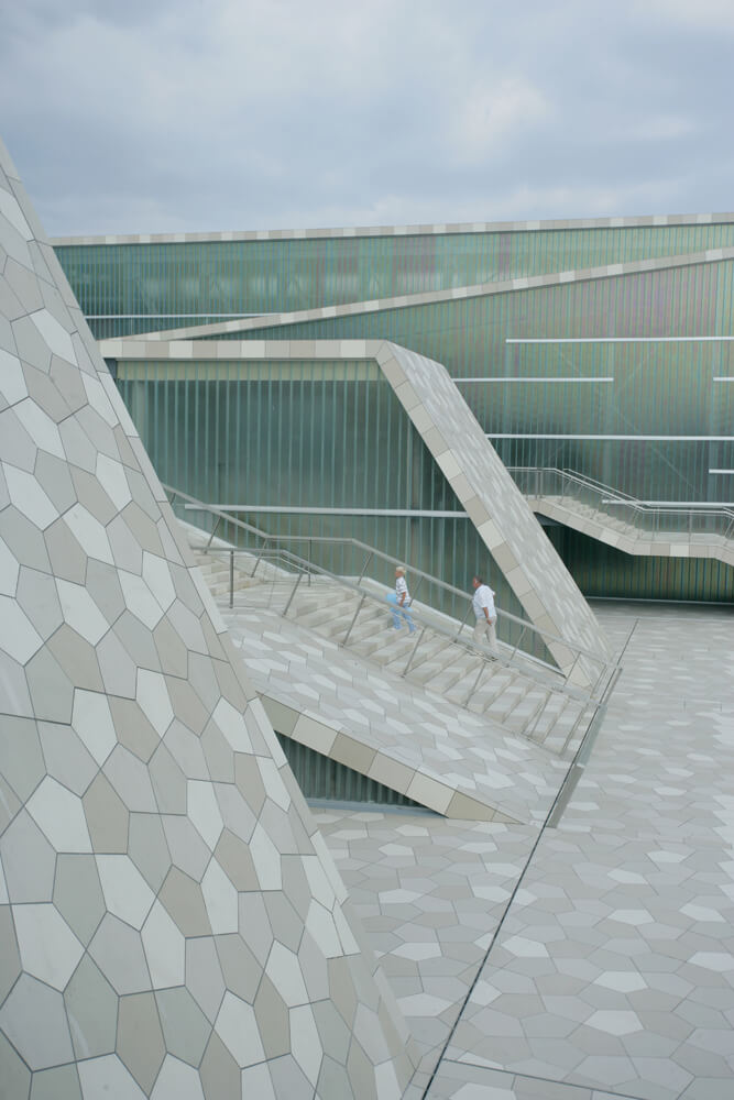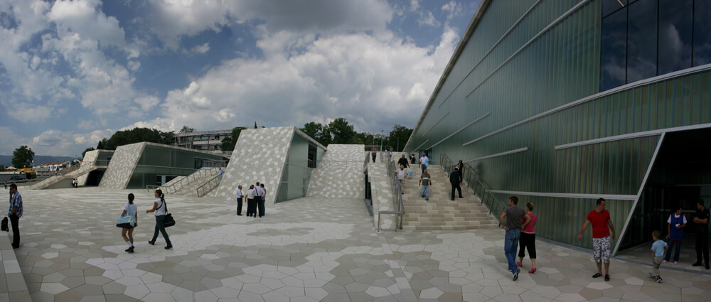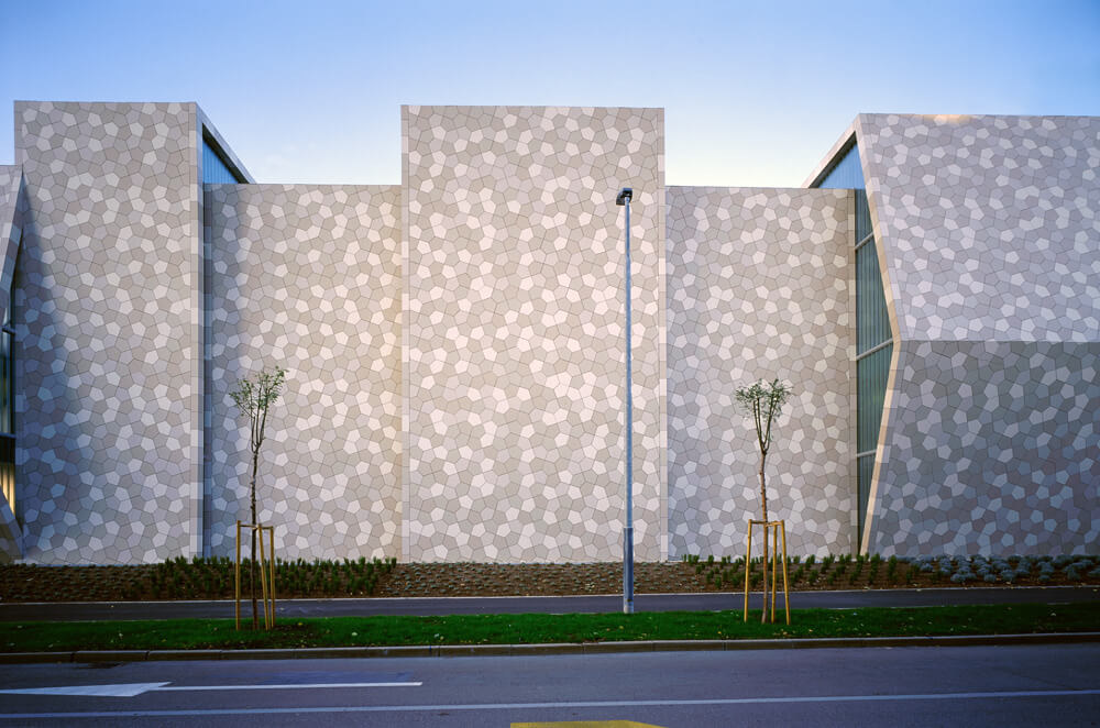 The ribbon-like stripes were inspired by “gromača”, a type of rocks specific to Rijeka, which the centre artificially reinterprets by colour and shape. Stripes are covered with 51.000 ceramic tiles designed by 3LHD and manufactured specially for the centre. Steel girders of 55 meters span and different heights enable the natural light illumination of the sports hall.
