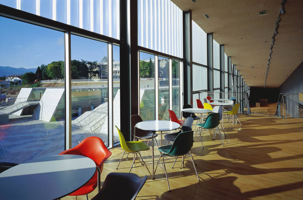 One third of the sports hall’s volume is cut in the ground, and other public facilities and services fully fit into the surrounding. The main architectural element of the Zamet centre are ‘ribbons’ stretching in a north-south direction, functioning at the same time as an architectural design element of the object and as a zoning element which forms a public square and a link between the park on the north and school and B. Vidas street on the south.