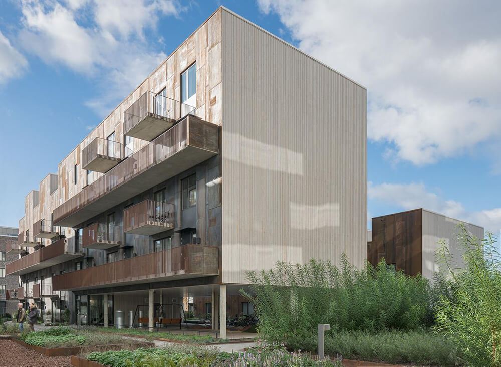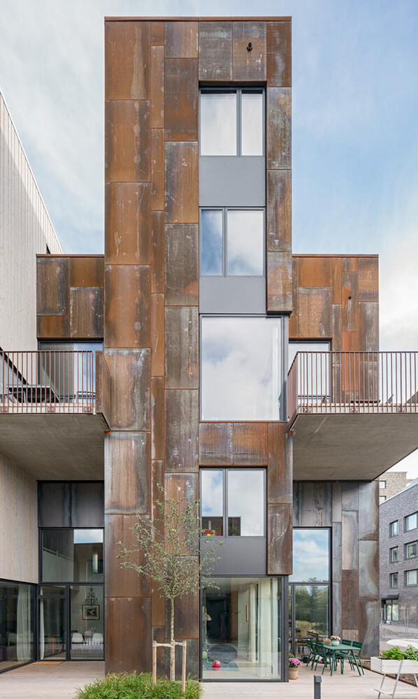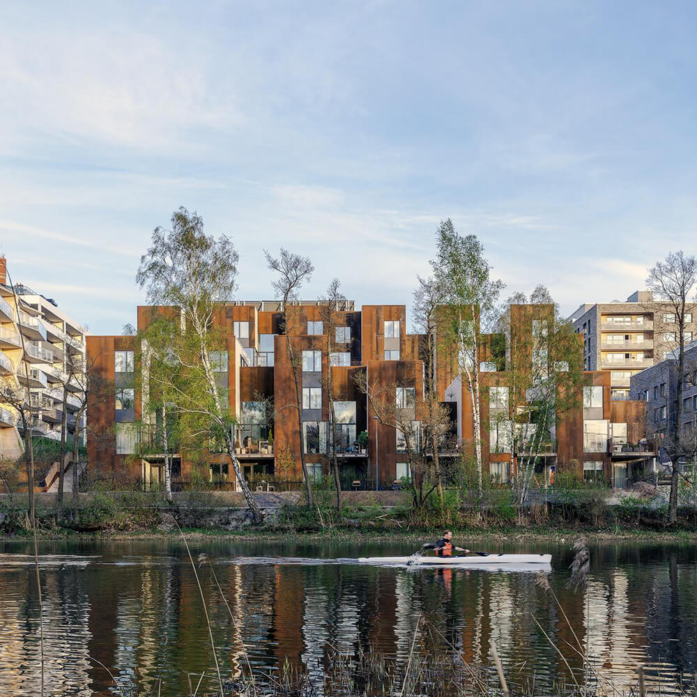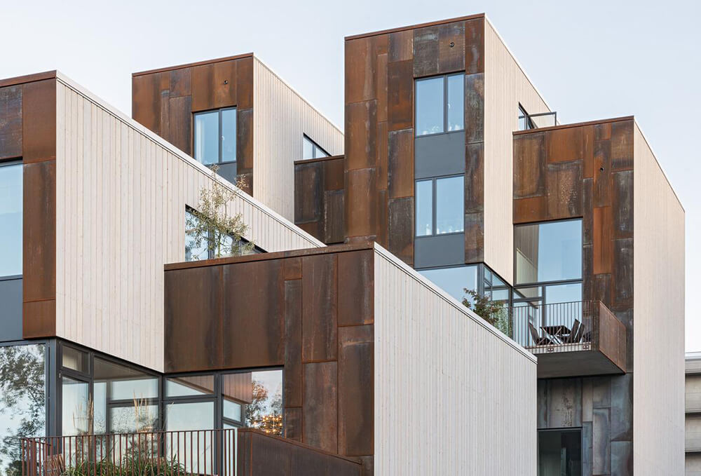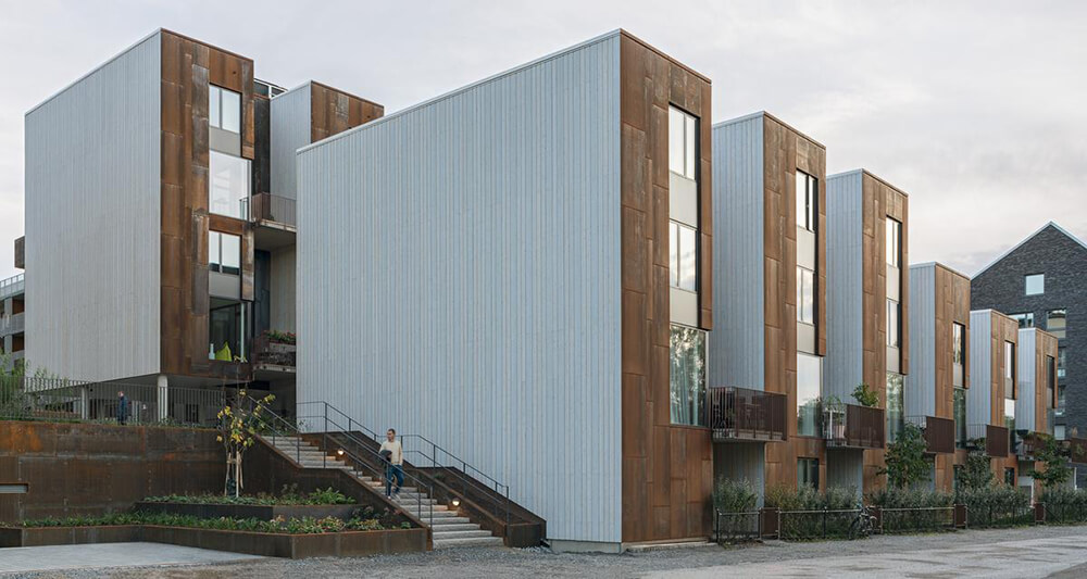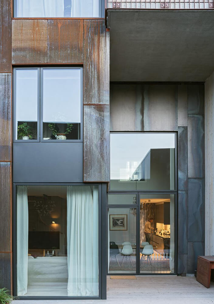 The name Zenhouses describes architecture with a strong relation to the site and integrated details with high precision. The buildings’ design weaves the indoors and the outdoors together, since the landscape and the outdoor environments are a significant element of how the homes are experienced. The Corten steel on the facades relates to the gasworks area’s red brick façades and the natural ochre colours of the Royal National City Park. The façades’ vertical lines are reinforced in the encounter between the Corten steel and the lighter wooden façades. The buildings’ folded façades and large continuous glass sections frame the private outdoor areas and terraces. Sight lines and double-high storey heights contribute to transparency and space, with daylight reaching deep into the homes. The materials selected for the interior are an extension of the residential complex’s natural materials of slate and wood.