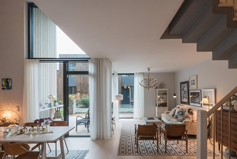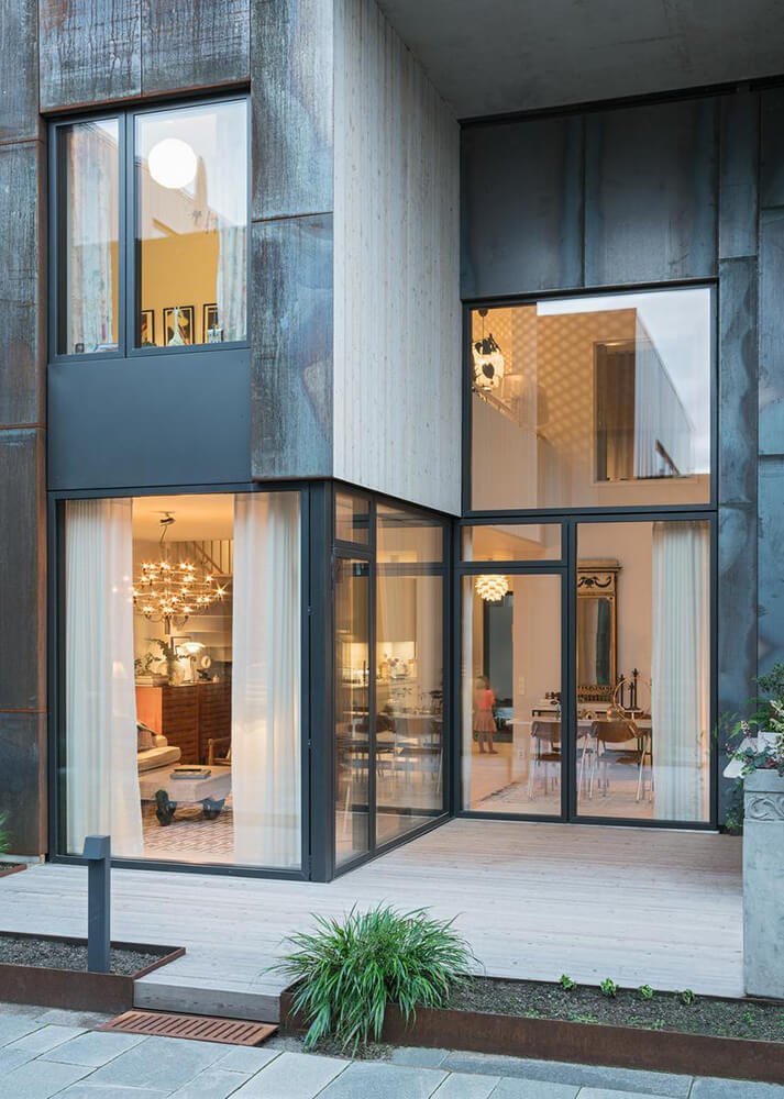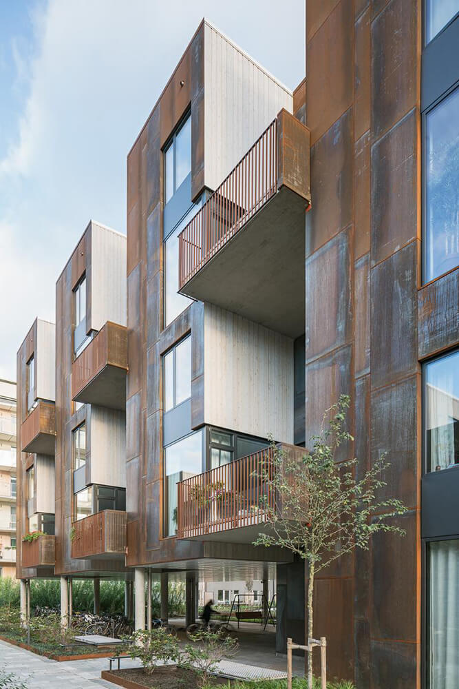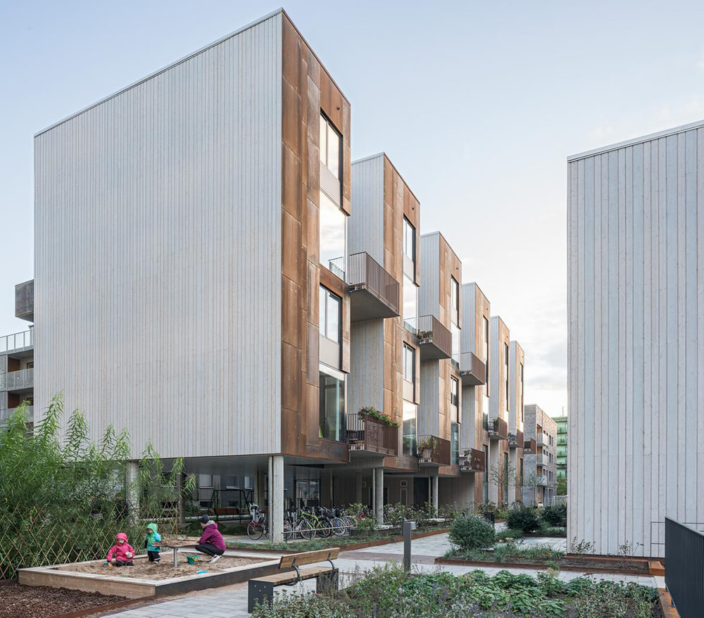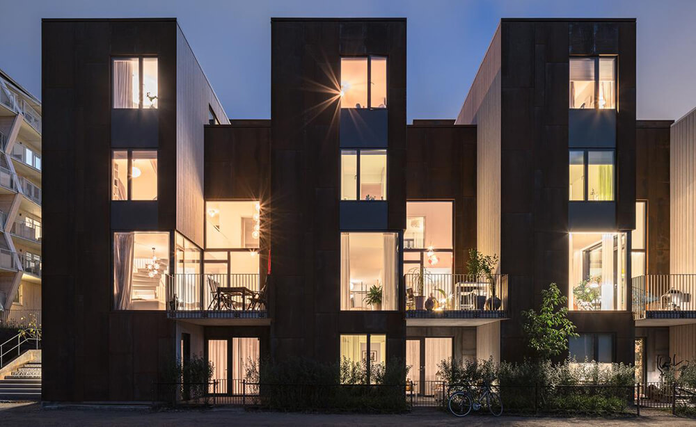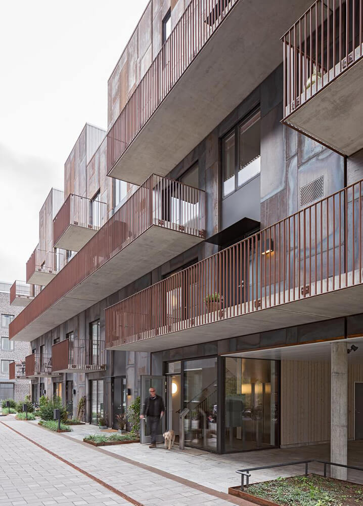 The name Zenhouses describes architecture with a strong relation to the site and integrated details with high precision. The buildings’ design weaves the indoors and the outdoors together, since the landscape and the outdoor environments are a significant element of how the homes are experienced. The Corten steel on the facades relates to the gasworks area’s red brick façades and the natural ochre colours of the Royal National City Park. The façades’ vertical lines are reinforced in the encounter between the Corten steel and the lighter wooden façades. The buildings’ folded façades and large continuous glass sections frame the private outdoor areas and terraces. Sight lines and double-high storey heights contribute to transparency and space, with daylight reaching deep into the homes. The materials selected for the interior are an extension of the residential complex’s natural materials of slate and wood.