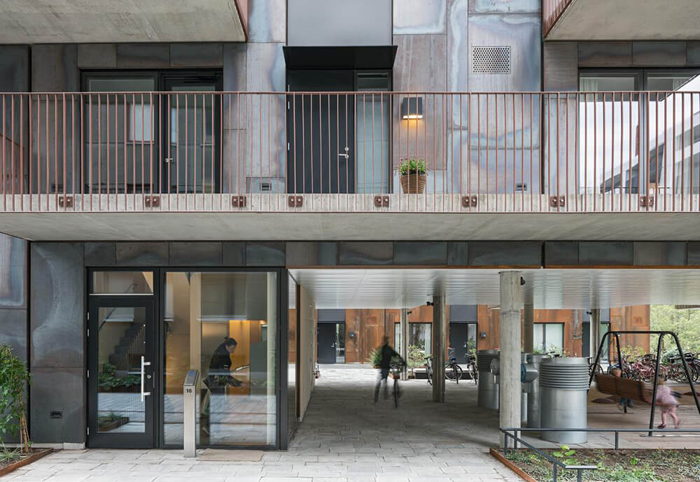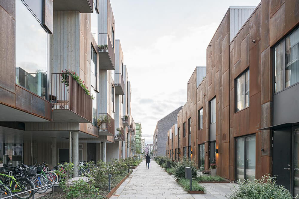 In accordance with the intentions of the plan for Norra Djurgårdsstaden, Zenhouses is part of an open residential neighbourhood. The alleyway between the two rows of townhouses is lined with entrances, private outdoor spaces and the elevated arcade that contributes social values to the quarter and the overall city plan. The landscape architecture and the vegetation interact with the buildings’ architecture and contribute to the project’s overall life cycle perspective. The choice of materials and vegetation have Nordic ties, in order to interact visually and naturally with the surrounding site. Sedum roofs and vegetation in rich soil allow for biological diversity, extensive ecosystem services and stormwater detention.