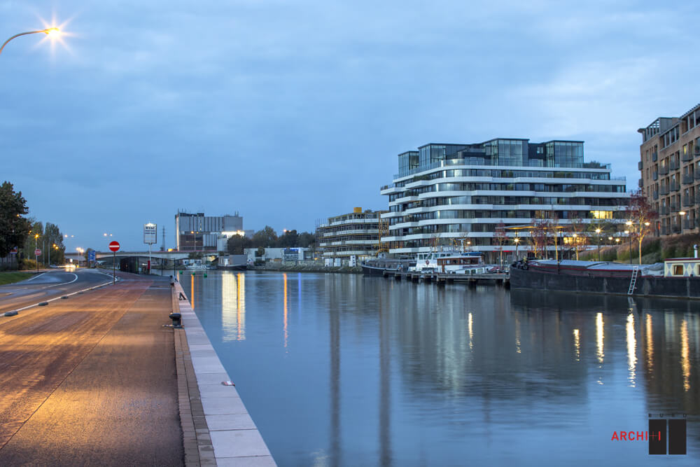 This project in Hasselt is sited in an inner-city redevelopment zone where a former industrial site north of the centre is being redeveloped around a canal basin.