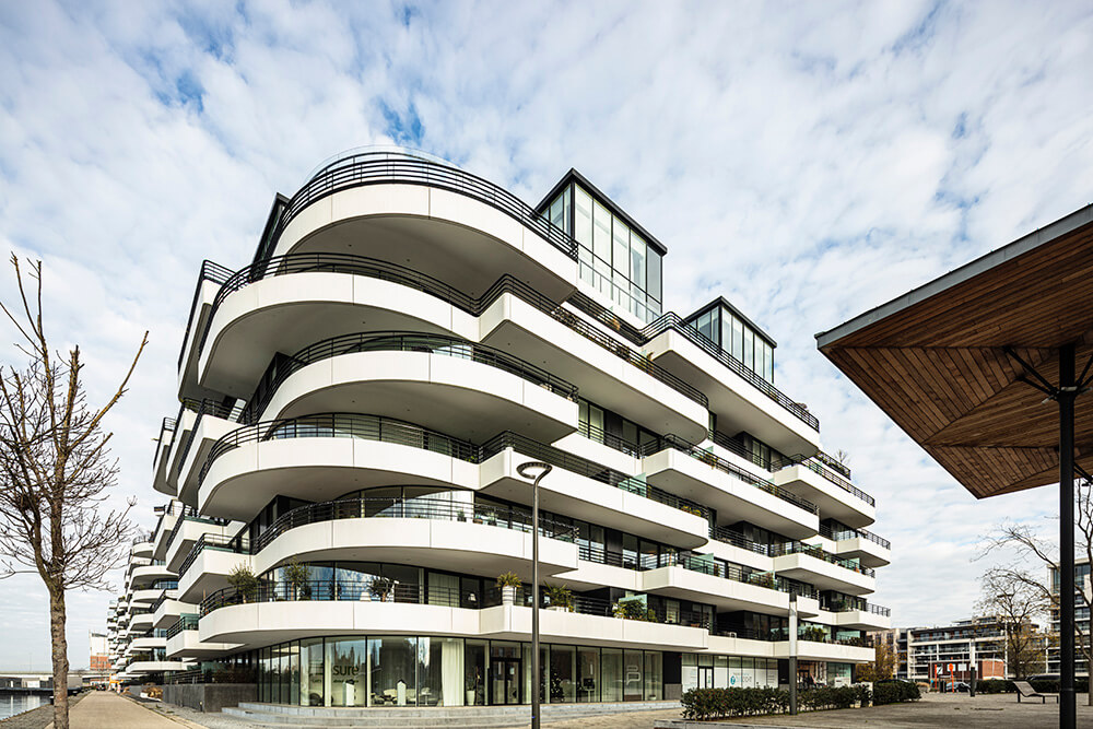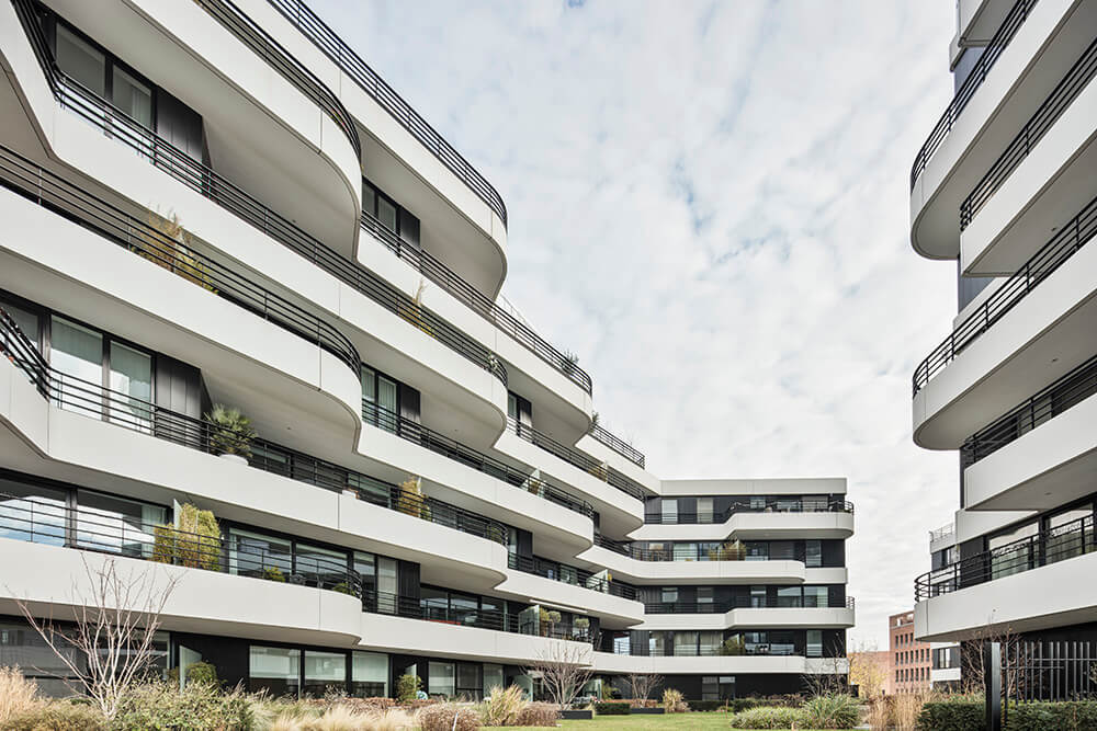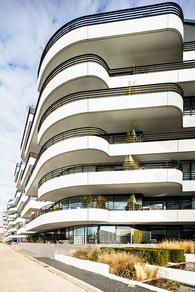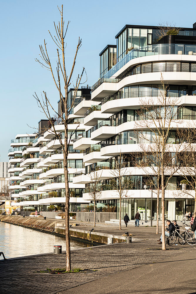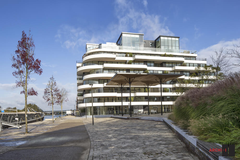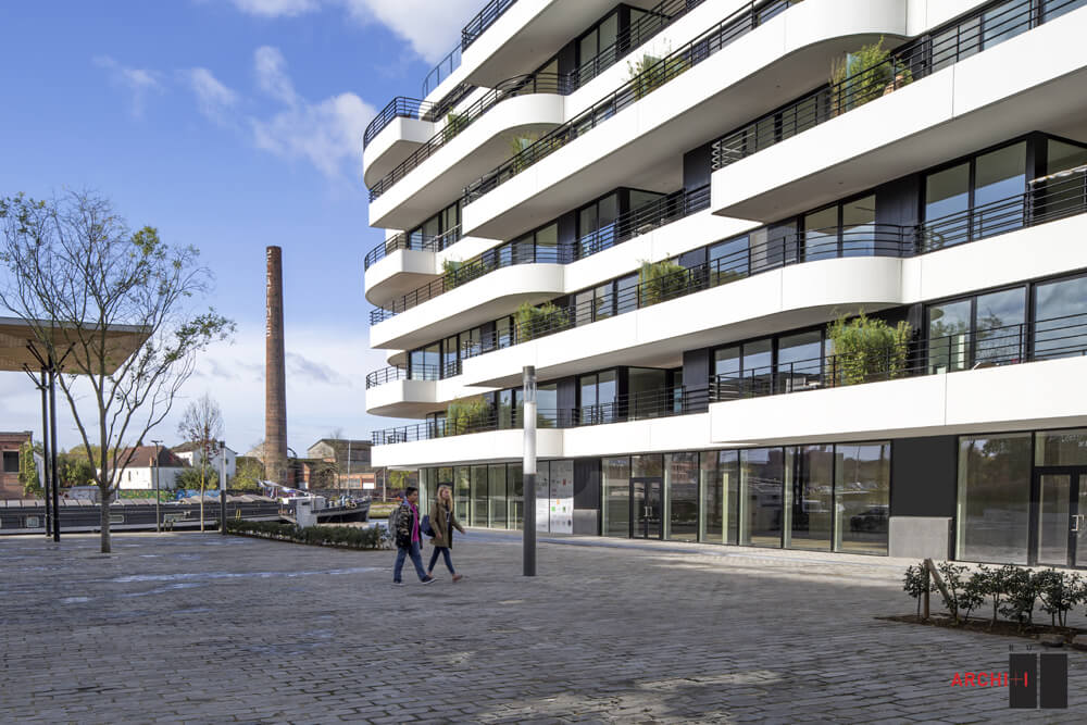 The architecture is open and light and displays a rapport with the water. The project has a scale made unobtrusive by fragmenting the volume and by the glazed embodiment of luxurious penthouse apartments with double-height rooms. The inner gardens open out to the canal and to the area to the rear.