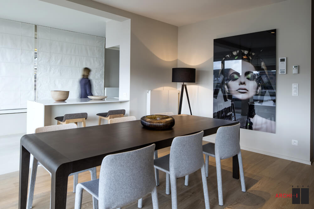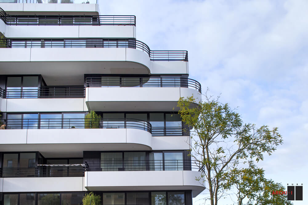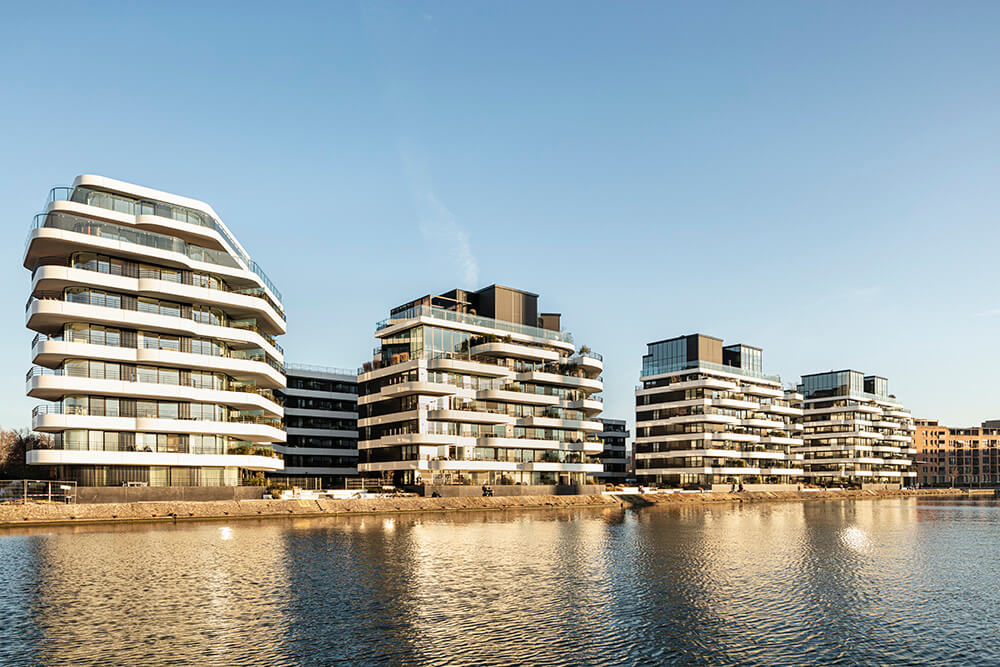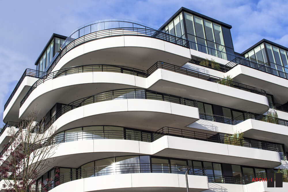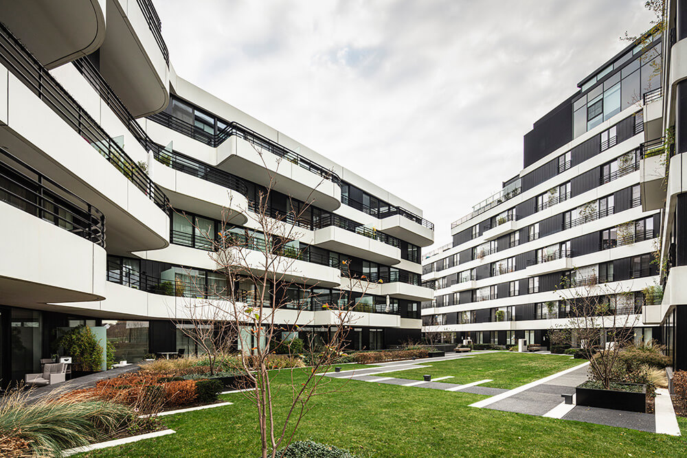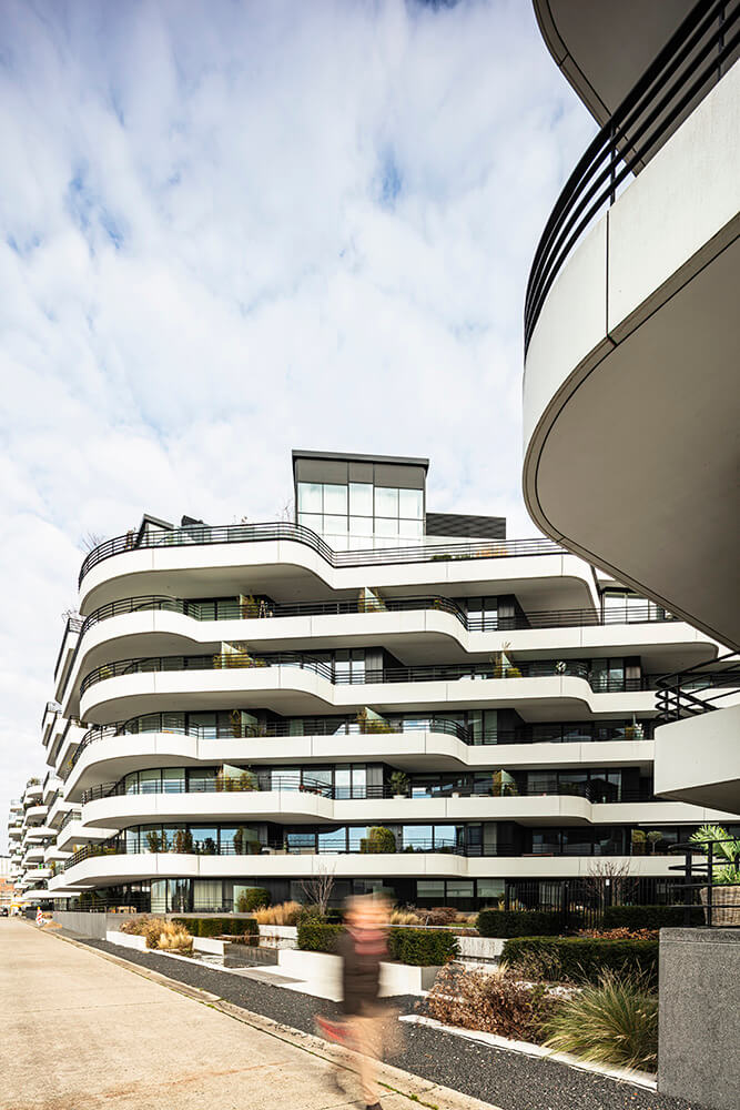 The architecture is open and light and displays a rapport with the water. The project has a scale made unobtrusive by fragmenting the volume and by the glazed embodiment of luxurious penthouse apartments with double-height rooms. The inner gardens open out to the canal and to the area to the rear.