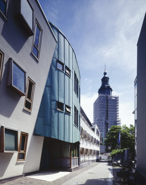 Some of the windows follow the same horizontal and slightly outwardly slanting planes of the slightly undulating surface of the façade, thus reflecting precisely how the façade as a whole is observed. Other windows, however, follow their own course by projecting from the façade like bay windows. They provide the rooms with indirect work lighting entering from above. Their alternating depth results in kind of optical illusion: a façade that requires an effort to understand what is actually being observed.